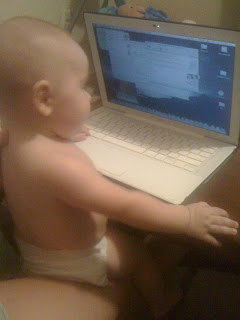 He is cutting teeth and has just recently learned to sit up on his own with little to no help from his mommy. He loves to talk to his Nanna on the phone and the computer. He gets on the computer by webcam and "types" to me which is so sweet. He also has been giving his mommy kisses.